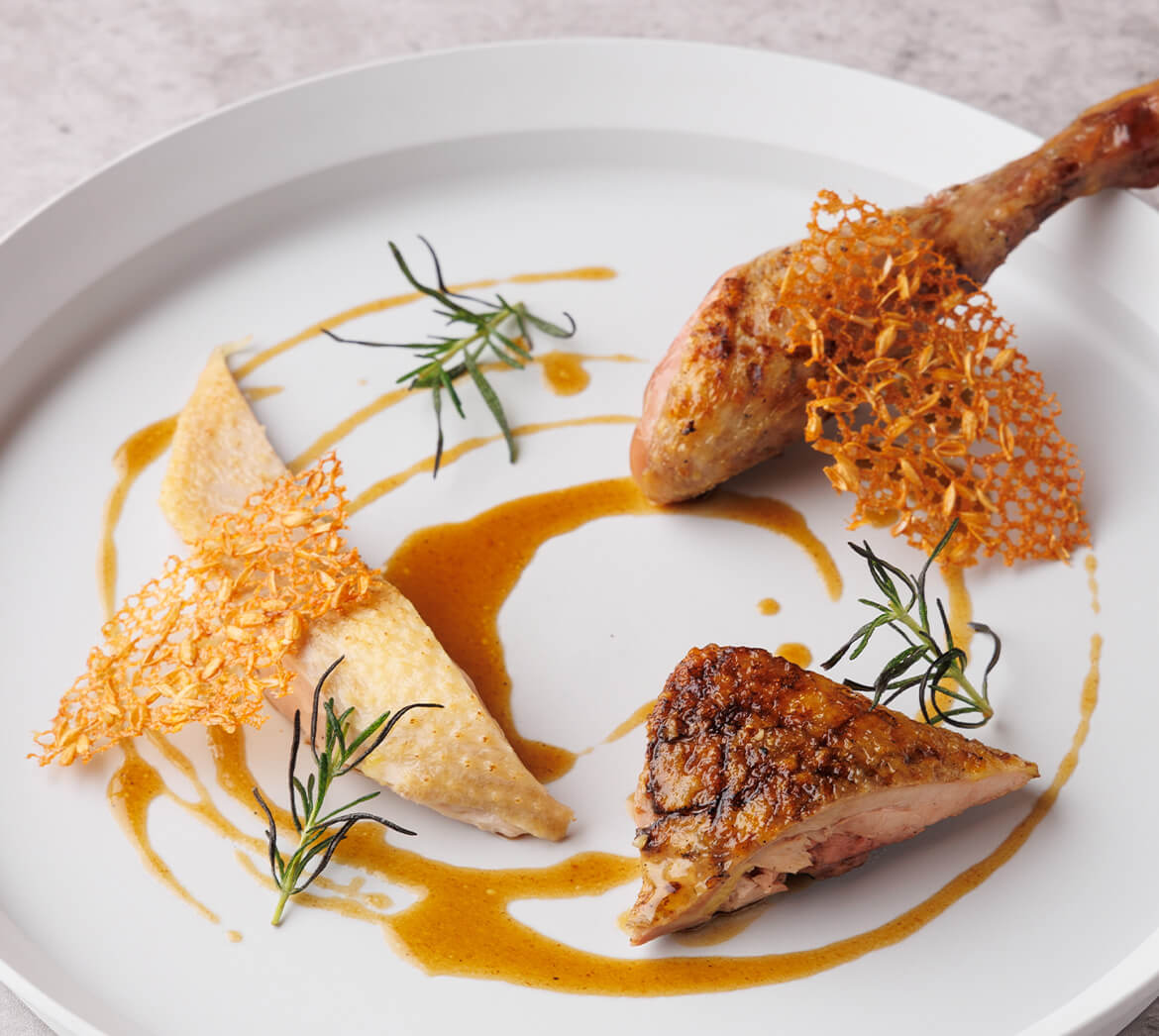岡本将士シェフが手がける新しいメニューは、軽井沢の豊かな旬と長野県各地の高品質な食材を味わう4品構成のプリフィックスコースが中心です。 2品以上のご注文でアラカルトもお楽しみいただけます。 料理は、フランスの伝統的な技法と日本の繊細な感性を融合させ、契約農家から届く無農薬野菜、ハーブ、食用花をふんだんに使用。さらに、信州の清らかな水で育った信州サーモン、野生の鹿や猪、そしてサステナブルに育てられた鴨・鶏・牛肉を取り入れています。 青森県産の“銀の鴨”や、40日間熟成させた赤城和牛など、炭火で丁寧に焼き上げたSHOLAのシグネチャーディッシュもぜひご賞味ください。世界一とも評されるヴィーガンバーガーをはじめ、多彩なデザートもご用意しております。 ランチやディナーには、軽井沢の移ろう季節を感じながら、厳選された長野産ワインや日本酒とともに、SHOLAでのひとときをお楽しみください。