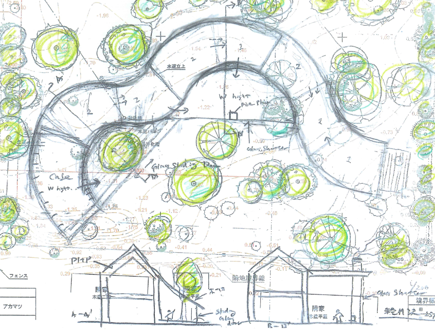 坂 茂氏が最初にこの地を訪れたとき、瞬時にししいわハウスのコンセプトをどう実現するべきかがわかったといいます。まず着手したのは、敷地内の260本以上の樹木一本一本の位置と高さなどの詳細を図面に記すこと。そして、それらの樹々に沿うように、建築スケッチを描いていきました。