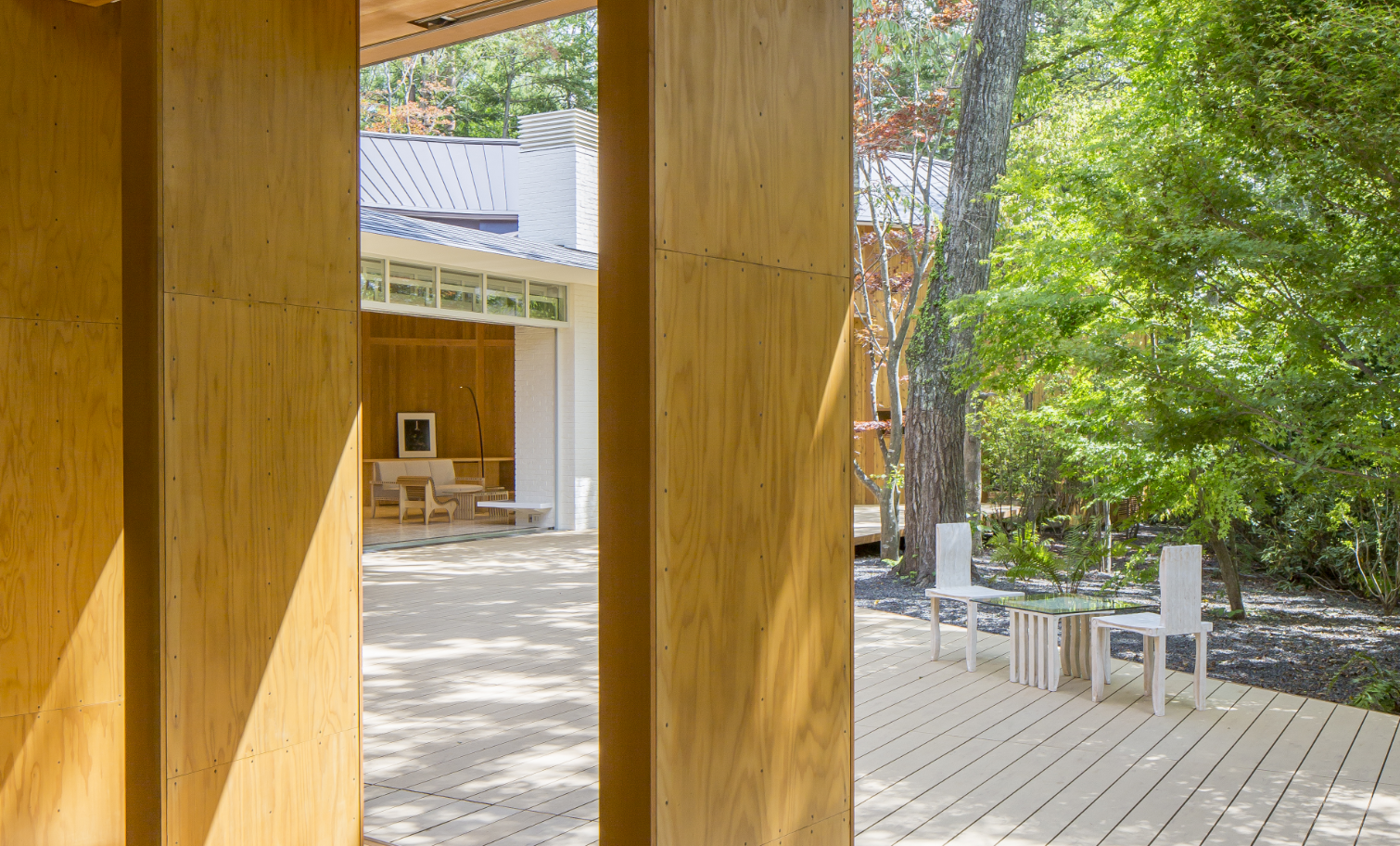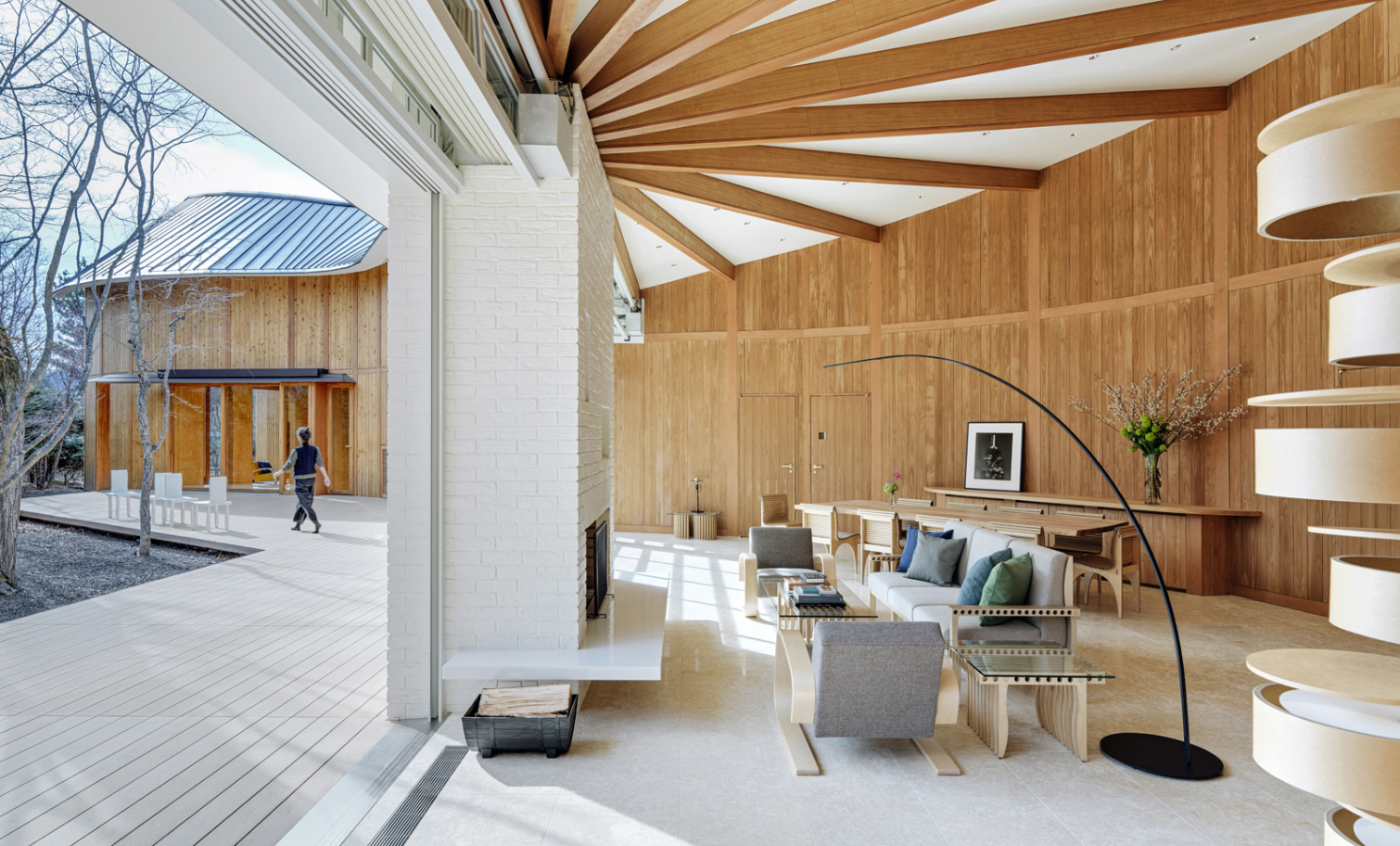その曲線の形状は、内部スペースに広々と流れるような一つの空間を生み出し、客室全11室、グランド・ルーム、ライブラリー兼レセプション、そして周囲の樹々を見渡すテラスを備えています。その効果とは? 澄みきったクリーンな空間、有機的な形と天然素材で創られた安息の地――デジタル時代の慌ただしい日常を離れた人々に、インスピレーションを与え、自然に人と人とが交流できる場所が誕生したのです。
