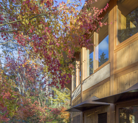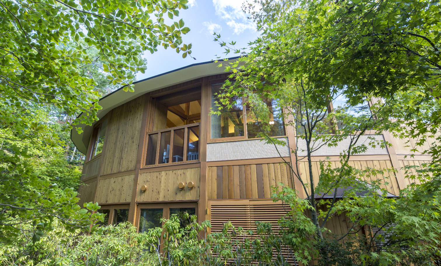 ししいわハウスの第1軒目は、日本人建築家として名高く、プリツカー賞受賞者の坂 茂氏が設計しました。軽井沢の自然の樹々に沿うように、有機的に設計された杉の木造建築は波のようにうねる曲線形状が特徴です。ジクソーパズルを想起させる木造2階建ての建築は、木造パネル工法を採用。革新的な「PHPパネル」(蜂の巣状のハニカム構造紙材を合板で挟み込んだパネル)を取り入れた「Aフレーム」37個の構造フレームを工場で作成し、現場で組み立て施工しました。