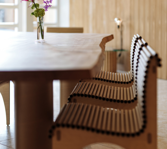 ししいわハウスのコンセプトはサステナビリティへの貢献にも根ざしています。その精神は、採用した素材にも顕著に見られ、PHPパネルや坂氏のシグネチャーである紙管の家具など(ベッドのヘッドボードからテーブルの脚部まで)部屋中に息づいています。