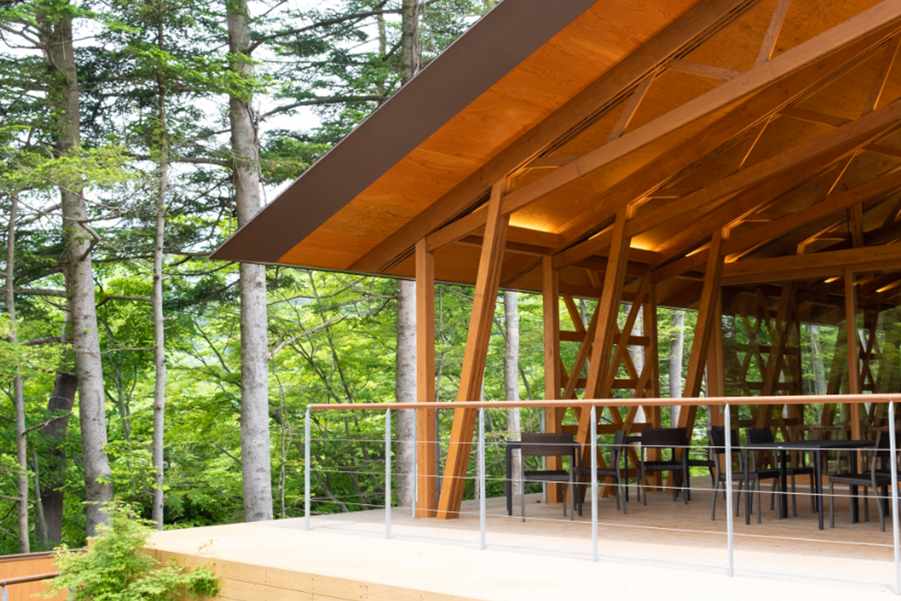 風に揺れる梢の間に浮かび上がる、温かみのある杉の木材とガラス壁面の直線が織りなす洗練を究めた建築。