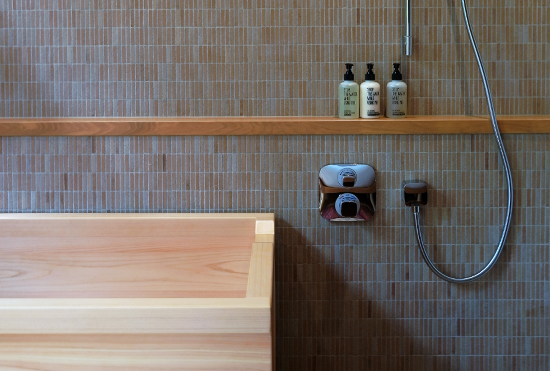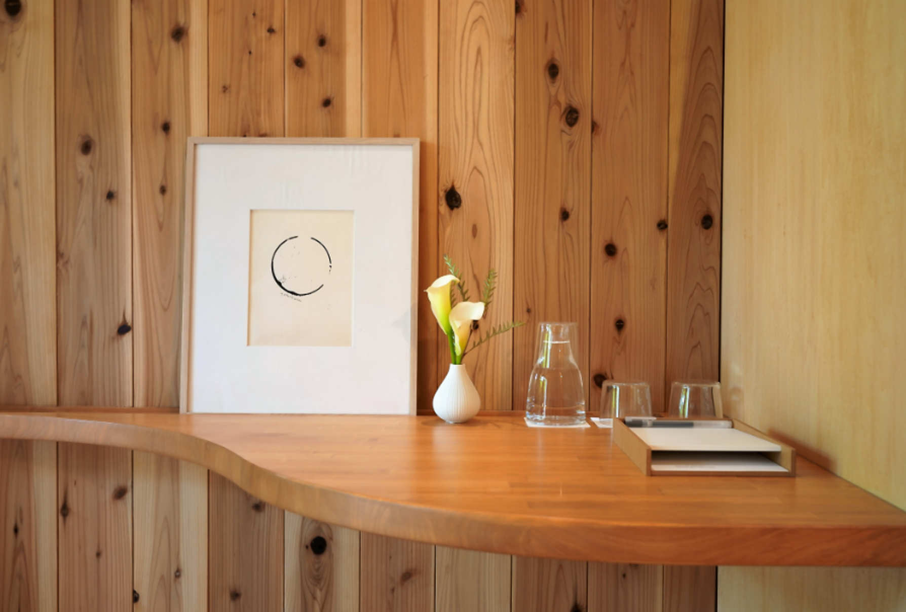 豊かな木材の組格子、紙管の家具、心地よいウッドパネルの壁、現代アートの写真、そして森林の風景ご堪能ください。
