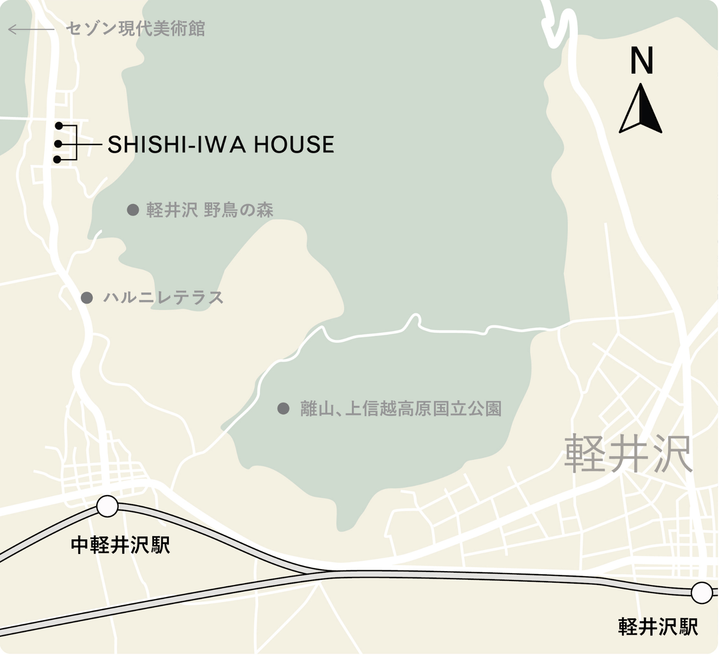 ししいわハウスのロケーションは日本の中央部、長野県・軽井沢。東京から:東京駅から軽井沢駅まで新幹線で(65分)、タクシー(10分)。お車で約2時間。